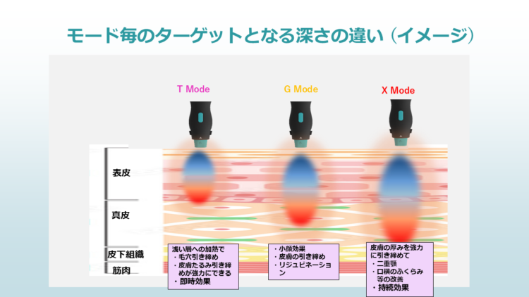 ▪Tモード:表皮〜真皮浅層 → 小じわ・肌質改善▪Gモード:真皮中層 → 肌のハリ・弾力改善