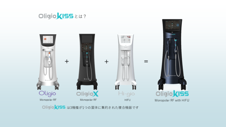 Oligio Kissは、RF(高周波)とHIFU(高密度焦点式超音波)を同時照射できるハイブリッド治療機器です。