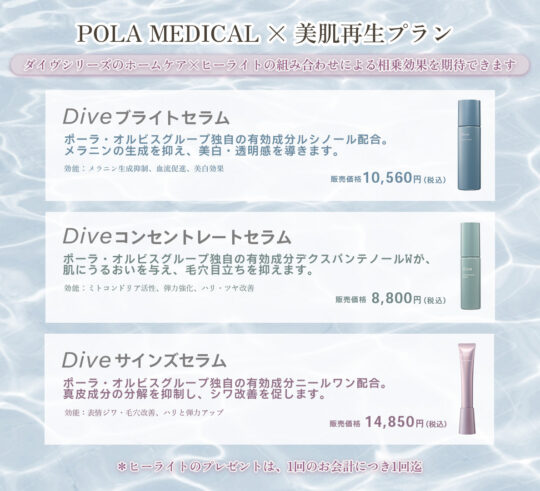 ▶︎▶︎POLA「Dive」シリーズの美容液と、当院の美容医療を組み合わせた再生プログラム